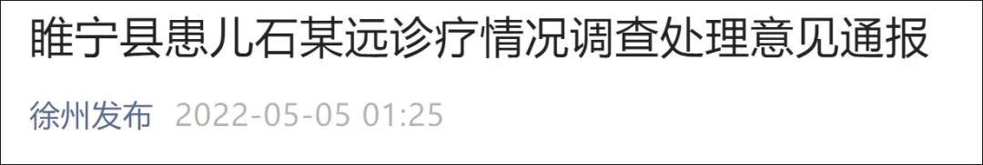 据微信公号“徐州发布”5月5日消息,4月29日夜,江苏徐州睢宁县患儿石某远因气管内异物,由家人送至睢宁县人民医院就诊,后经睢宁县急救医疗站转诊至徐州新健康医院救治,4月30日晨经抢救无效死亡。徐州市委、市政府及睢宁县委、县政府对此事深表痛心,成立了由市县纪委监委、卫健、公安等相关部门及医疗专家组成的联合调查组,对患儿诊疗情况开展深入调查。