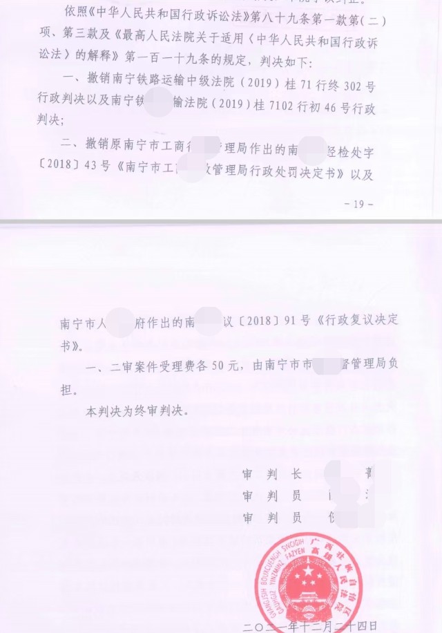 近日,本站收到一网民投稿,原文如下。浙江亚厦幕墙有限公司(简称为亚厦公司)诉南宁市市场某局(简称为南宁市某局)及南宁市某府行政处罚与行政复议一案南宁铁路运输中级法院于2020年9月21日作出(2019)桂71行终302号行政判决,已经发生法律效力,亚厦公司不服向本院申请再审。本院作出(2021)桂行申195行政裁定,提审本案,本院依法组成合庭,公开开庭审理了本案,再审申请人亚厦公司的委托诉讼代理人张某,被申请人南宁市某局的出庭应诉负责人李某,委托诉讼代理人谢某、李某,被申请人南宁市某府的委托诉讼代理人梁某,到庭参加诉讼。本案现已审理终结。判决如下:一、撤销南宁铁路运输中级法院(2019)桂71行终302号,行政判决以及南宁铁路运输法院(2019)桂行7102行处46号行政判决;二、撤销原南宁市某局作出的南工商经检处字(2018)43号《南宁市某局行政处罚决定书》以及南宁市人民政府作出的某某复议(2018)91号《行政复议决定书》。一、二审,案件受理费各50元,由南宁市某局负担。本判决为终审判决。