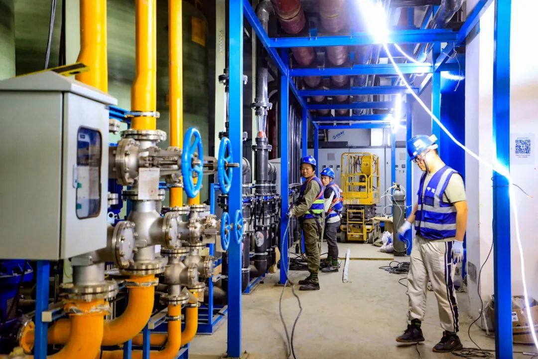 厂房墙体黑色保温层、真石漆工序同步推进;厂区内挖掘机、渣土车等工程车辆一刻不停;配电室里绿灯闪烁,电力稳定输送;冷却机房内,建设工人们焊接、安装、调整,紧张快干……